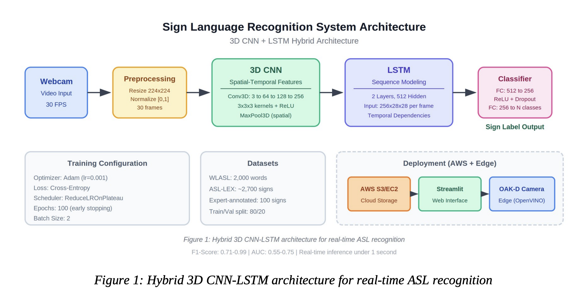 Inspired by these calls to action, our team has focused on solving the "Temporal Modeling" challenge mentioned in the research. We realized that sign language isn't a series of static poses; it is a volumetric dance of hands, body, and facial expression over time. To capture this, we’ve adopted and expanded upon the 3D CNN-LSTM hybrid architecture.